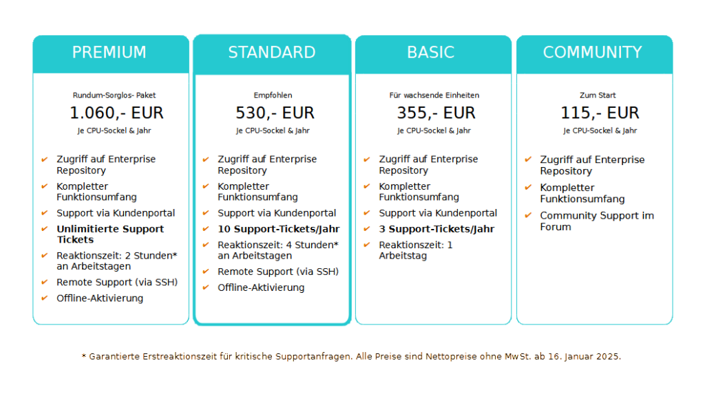 - Neben der Community-Edition gibt es noch drei weitere Subskriptionseditionen, die jeweils unterschiedliche Supportleistungen beinhalten.